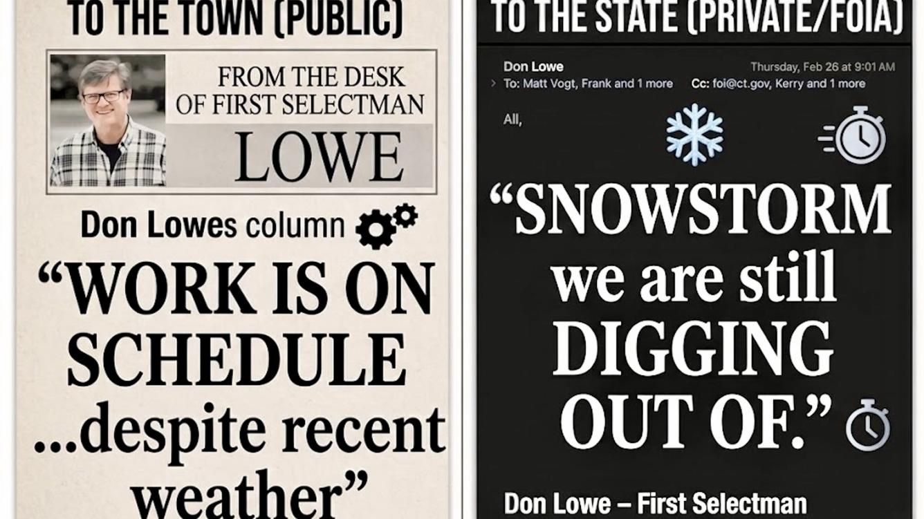 First Selectman Don Lowe uses winter weather to boast of construction progress to the press while simultaneously citing it as a legal defense to withhold public records from the state.