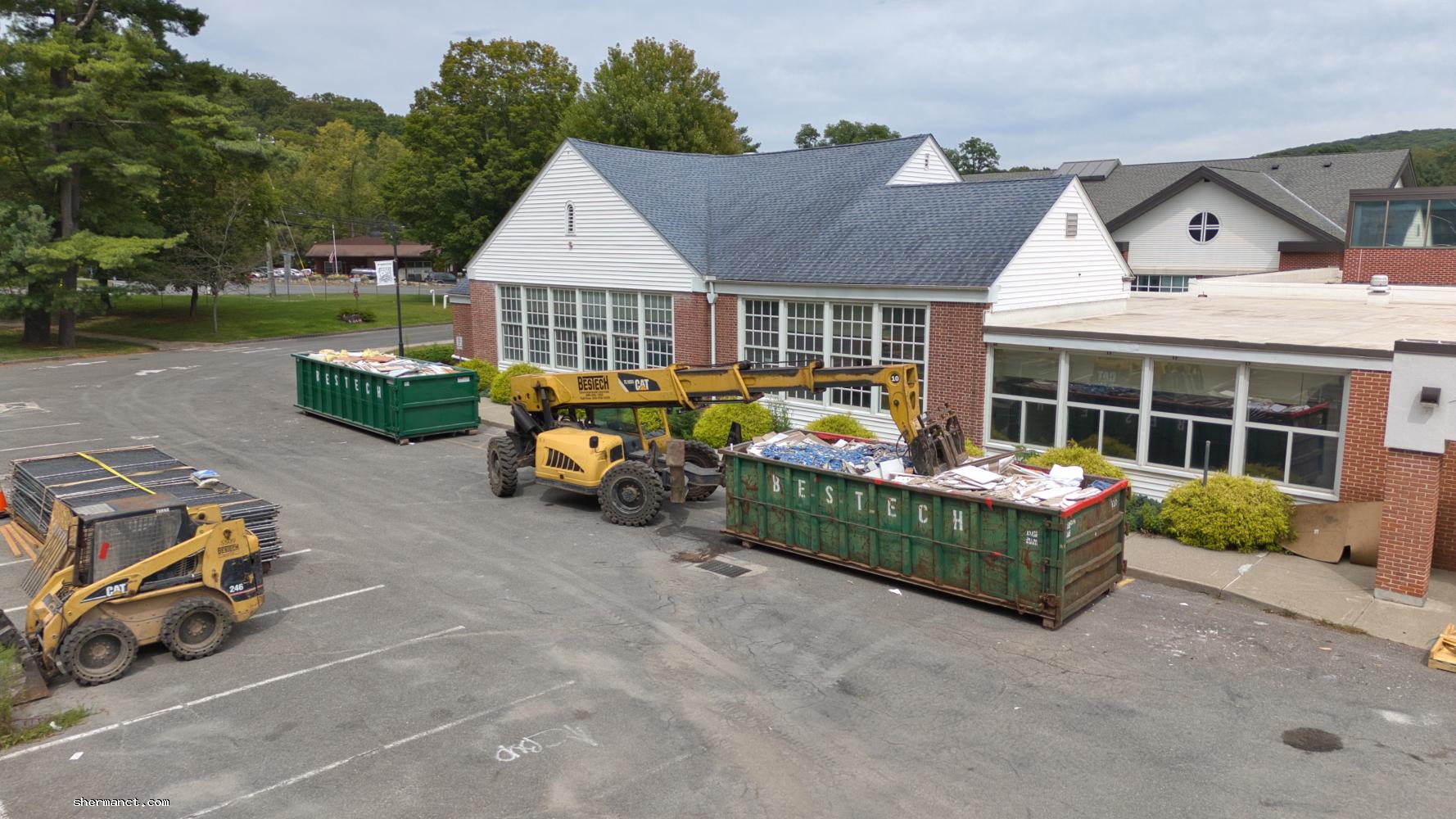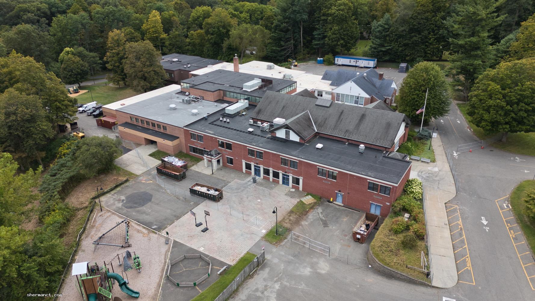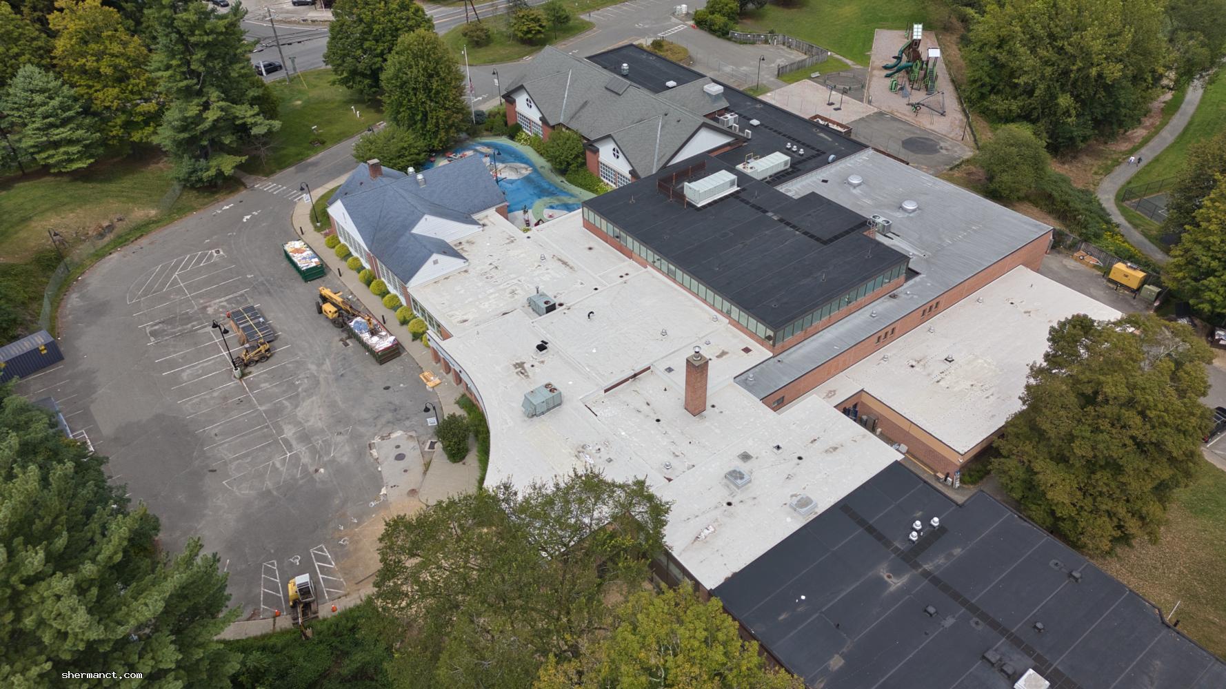 For now, the most visible progress is logistical: fencing, dumpsters, and earth-moving patterns captured from above. The aerial perspective offers a rare sense of scale — Sherman School’s wide lawns now carved by tire tracks, suggesting the methodical advance of equipment staging rather than full demolition.