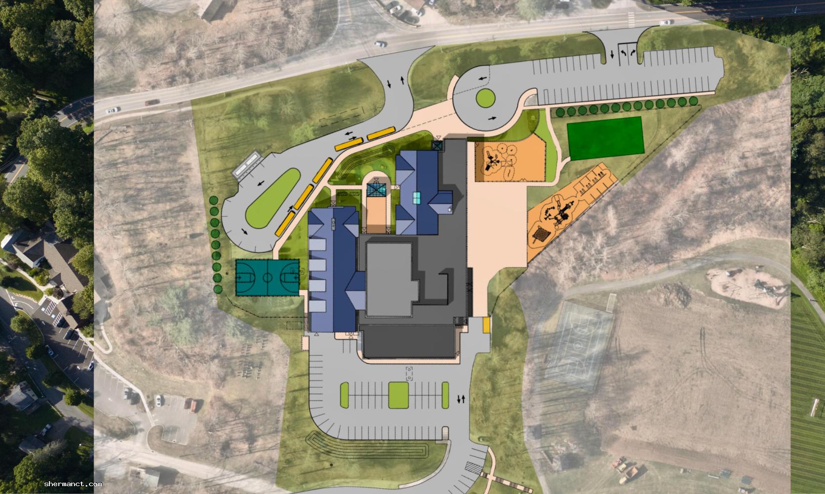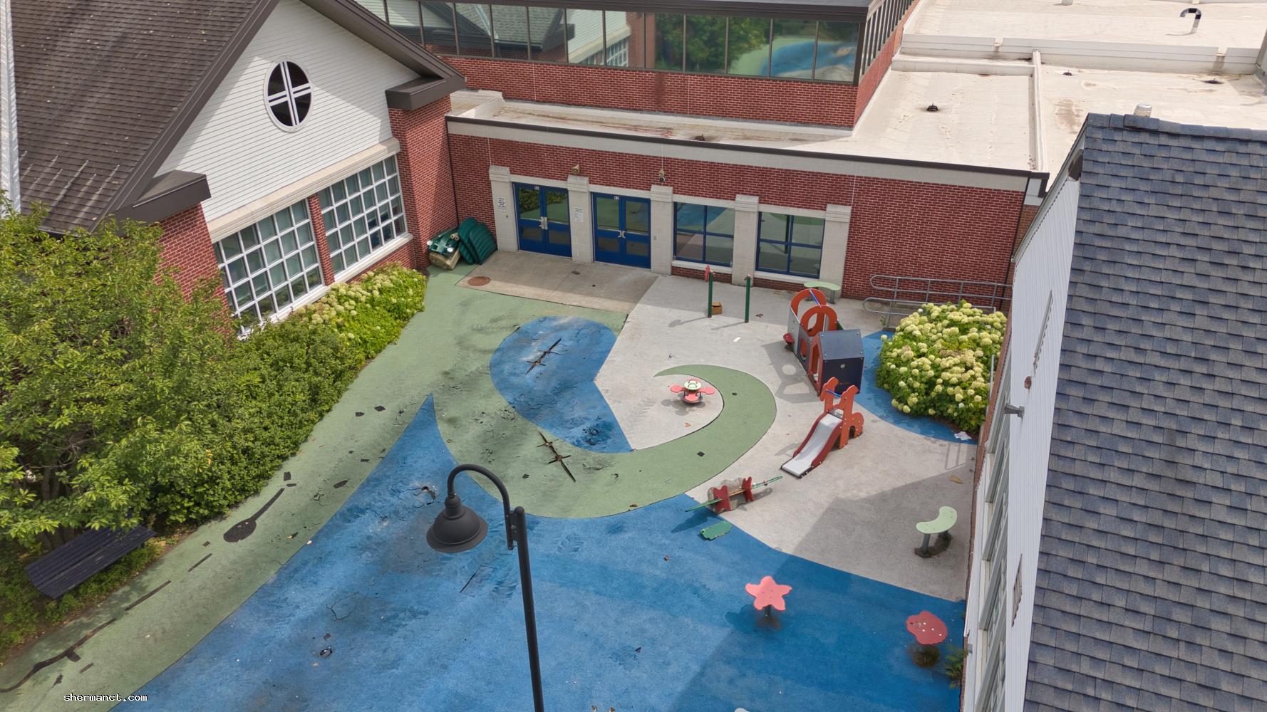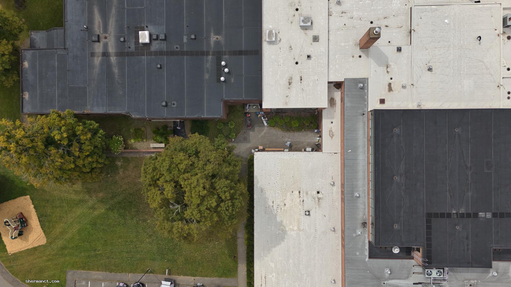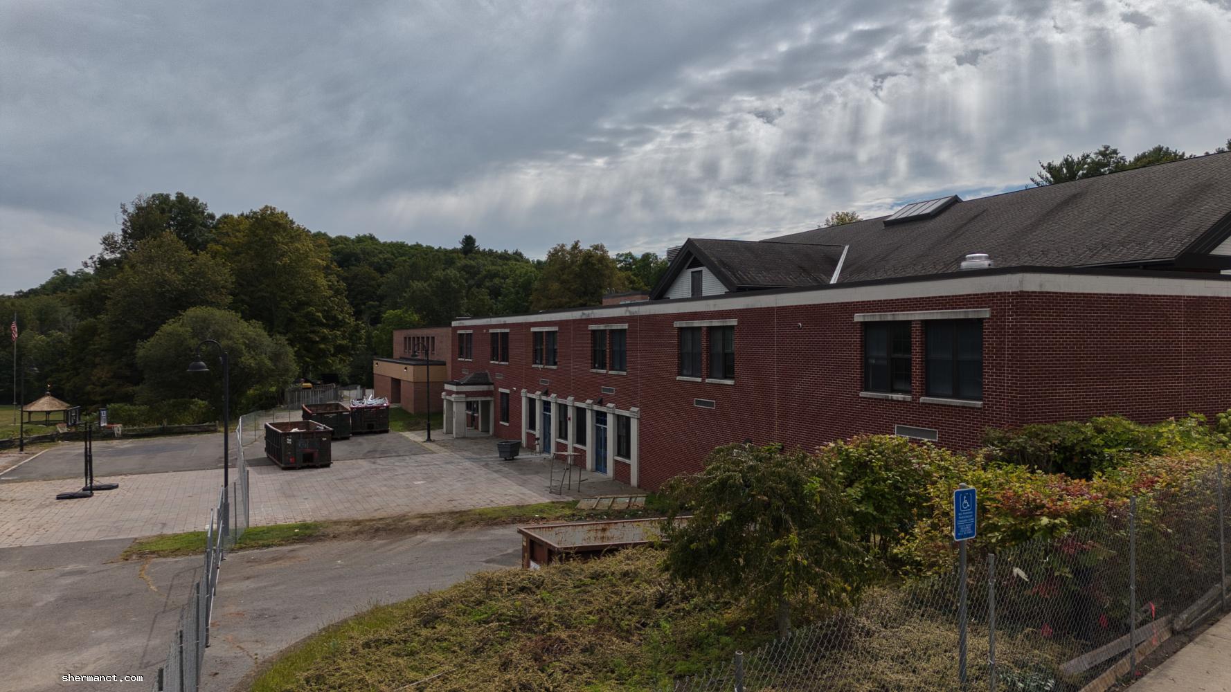For now, the most visible progress is logistical: fencing, dumpsters, and earth-moving patterns captured from above. The aerial perspective offers a rare sense of scale — Sherman School’s wide lawns now carved by tire tracks, suggesting the methodical advance of equipment staging rather than full demolition.