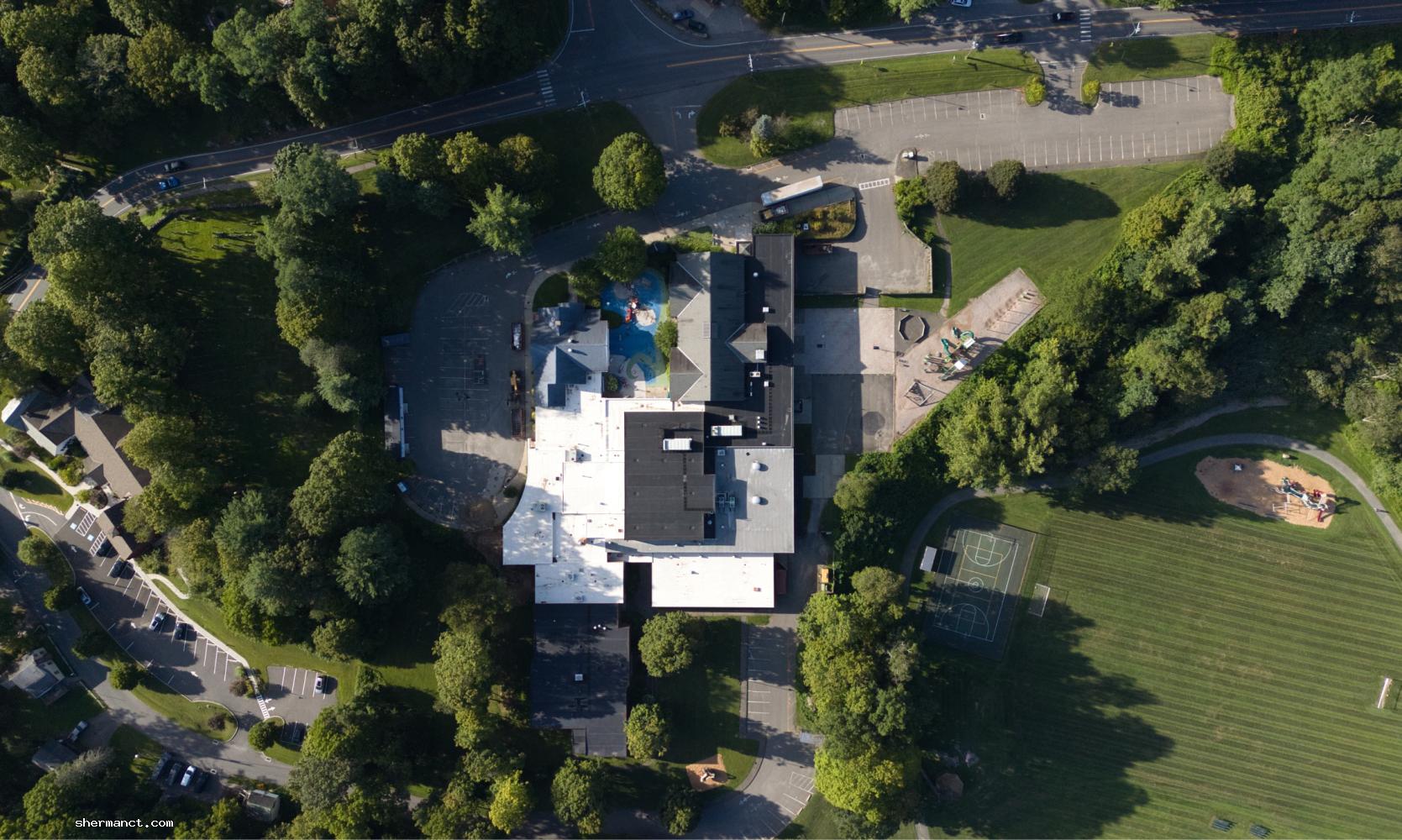 Sherman, Conn. — From above, the scene at Sherman School tells a story of anticipation. Fresh aerial images taken by a professional drone pilot reveal the campus ringed by fencing, with industrial-sized dumpsters stationed like sentries around its perimeter. On the grassy fields and dirt stretches nearby, the tracks of heavy machinery crisscross in deliberate arcs — the early signatures of a project just beginning to reshape one of the town’s most important institutions.