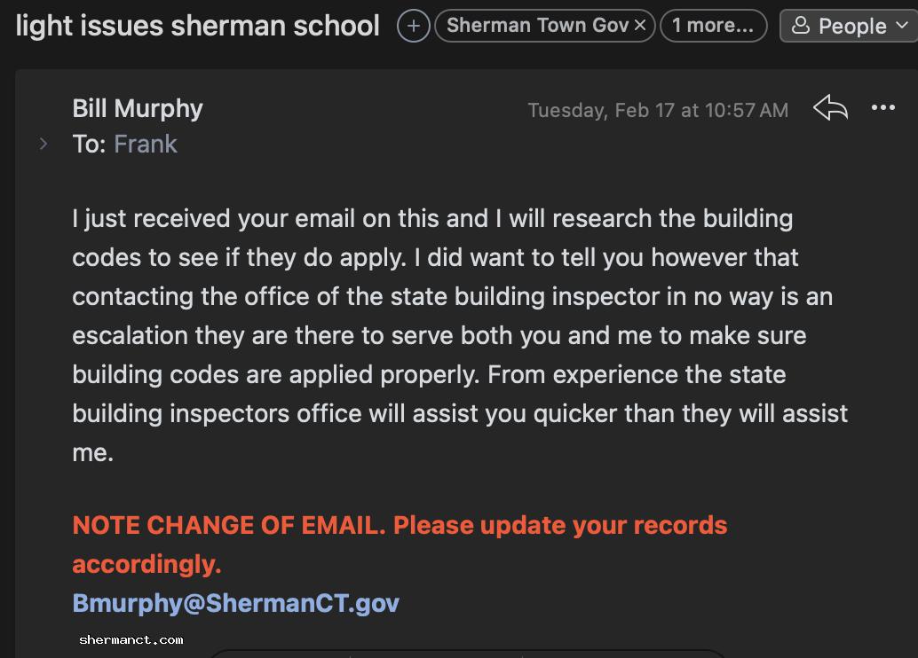 Rather than a dereliction of duty, Murphy’s response reads like a man who knows his department has been completely outflanked by the sheer scale of a $42.8 million municipal behemoth. By explicitly deferring to the State Building Inspector, Murphy confirmed a terrifying reality: The local Building Department has no real teeth here. They have been sidelined, leaving the oversight of Sherman's most expensive asset to distant bureaucrats in Hartford.