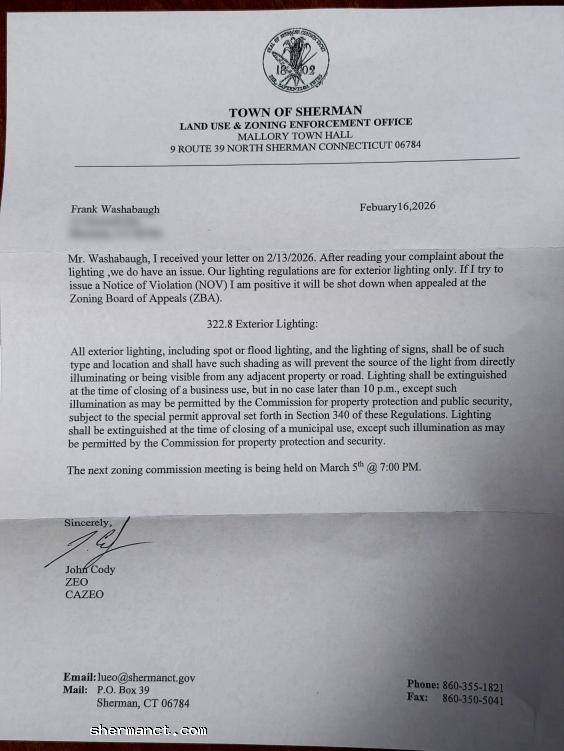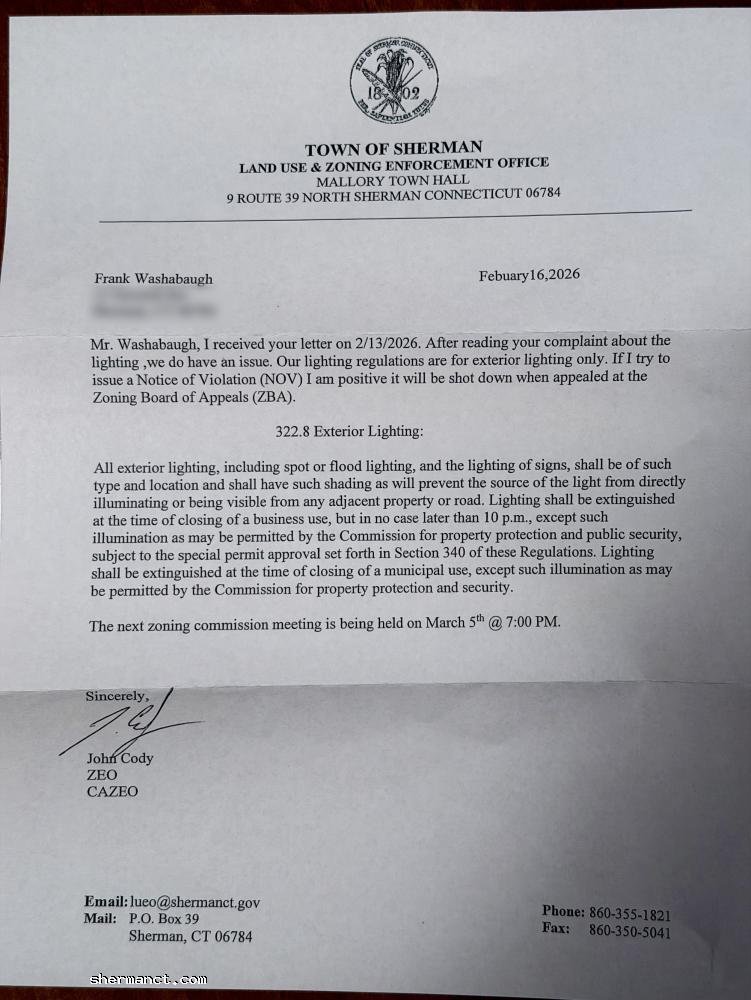 So, an official zoning complaint was filed. On February 16, 2026, Zoning Enforcement Officer John Cody responded with a formal letter that was less a refusal to do his job, and more a quiet admission of his own bureaucratic castration.