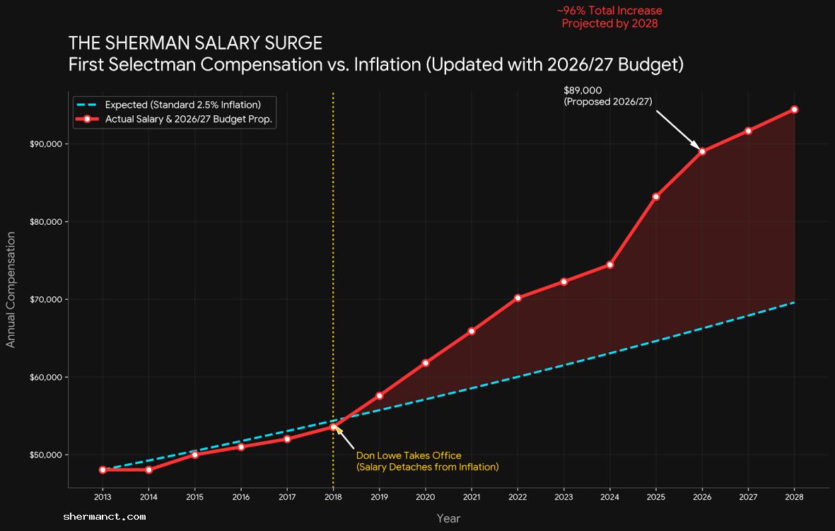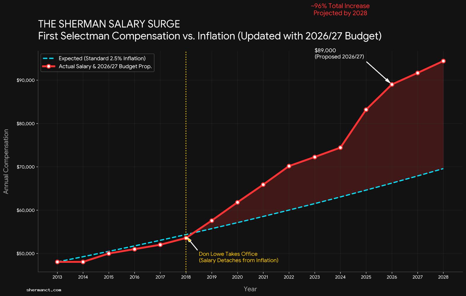 The historical data paints a vivid picture. For years, the First Selectman’s salary tracked predictably, tethered to a standard 2.5% inflation rate. Then came 2018. From the moment Mr. Lowe took office, executive compensation violently detached from economic reality, embarking on a steep, uninterrupted ascent. With this latest 7.0% bump, the office is now hurtling toward an unprecedented 96% total compensation increase by 2028.