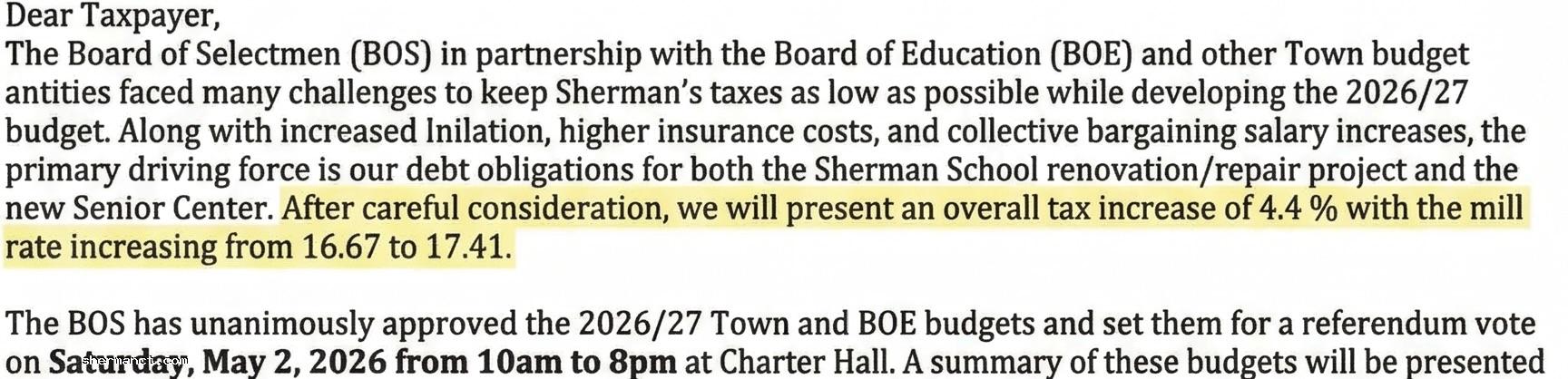 Sherman has enjoyed a decade of relative tax stability. But the $50 million school renovation project—and the resulting $32 million local bond required to pay for the town's share—has fundamentally altered Sherman's financial reality.