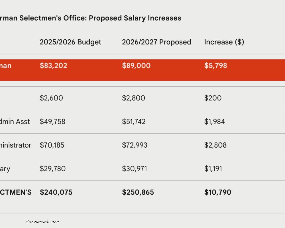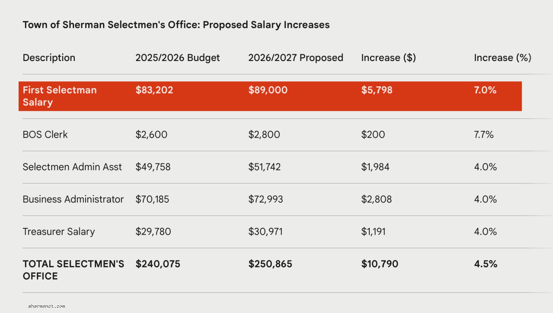 The First Selectman's personal raise dramatically outpaces inflation, eclipses his staff's compensation, and easily clears the 4.44% tax hike he is passing onto the residents. It is a textbook case of self-indulgent enrichment—austerity for the taxpayers and the staff, but a blank check for the corner office.
