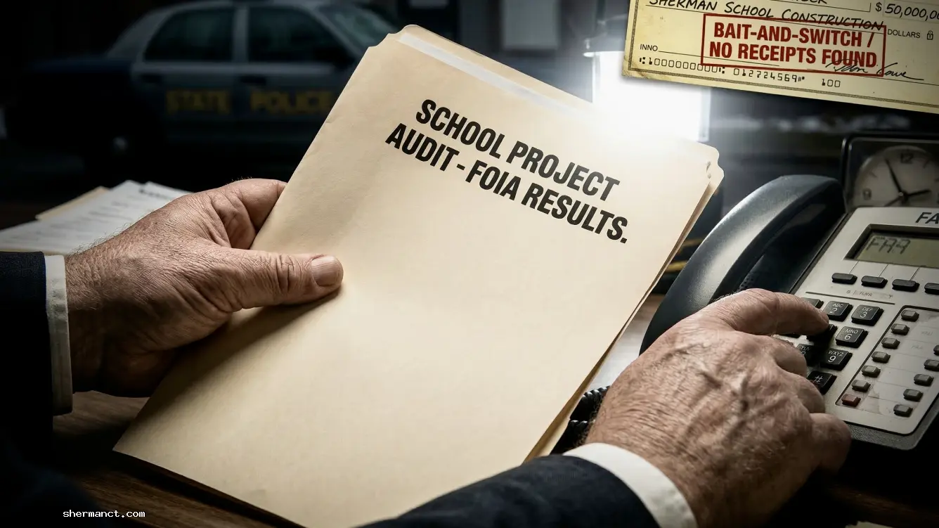 As the Sherman School project balloons to a staggering $50 million, FOIA requests reveal a terrifying void of daily logs and oversight. When Sherman CT News pointed a camera at the site, Town Hall responded with police intimidation and a literal corridor